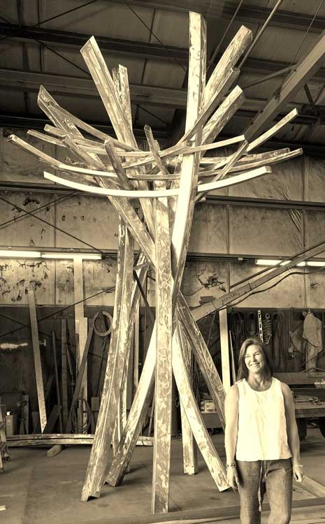 What is 18 feet tall and weighs over 5,000 pounds? Merrillee Moore’s stainless steel sculpture “Aerie.” Born and raised in the Northwest, Moore sees the empty nest as a welcoming presence and a “symbol of home.”