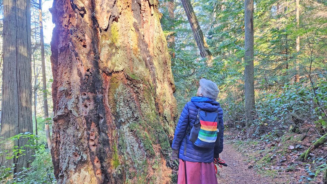 We stopped by a monstrously majestic Douglas fir, with thick bark and a soaring crown. It was a sapling during the dark ages; a mature tree when Columbus discovered America, when Galileo observed that the earth goes around the sun, when Shakespeare wrote his plays. It was already an ancient tree when Vancouver anchored in Guemes Channel, when Amos and Anna Curtis settled nearby, and -- what to me seems so long ago -- when I was born.