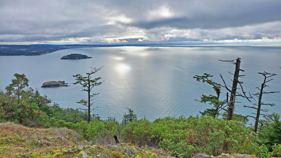 All was quiet, other than our labored breathing climbing back up to the end of the loop, to the overlook facing west, beyond Fidalgo, over Rosario Strait, over the misty San Juans and Vancouver Island, across the broad expanse of Juan de Fuca into the ether of a world without end.