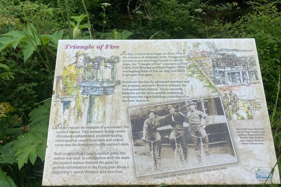 I approached an Interpretive sign and read about the remnants of Fort Casey that are almost grown over here. Admiralty Inlet, named in 1792 by British explorer, George Vancouver, was noted as a gateway to this inland sea. The military was strategic building forts on both sides of the water in the 1890s. A spotting station occupied this site. It’s hard to imagine now, walking this trail on a pleasant spring day, that this was part of a large fort at one time.