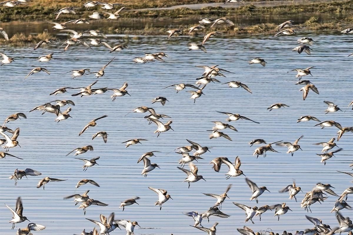 Approaching that shoreside shed a quarter mile from the trailhead, we saw a joyous sight, for us humans, but a panicked response from the dunlins on the water. Hundreds of them were flying in the tightest formation you can imagine, going this way and that, above and along the slough, a hundred feet this way, a tight turn, a hundred feet that way, another turn, then settling down for a minute, then resuming the flight again, wingtip to wingtip, each bird changing direction in a choreographed aerial dance, flashing white bellies then dark backs, up the slough and down the slough, then back to another landing.