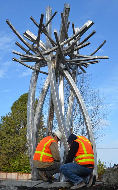 In 2010, Moore’s design was chosen by the Anacortes Arts Commission out of 30 proposals. That same year the City Council approved it for the centerpiece of the Commercial Ave. roundabout. In 2013, after installation requirements for the state Department of Transportations were met, and Moore began the process of creating the sculpture.