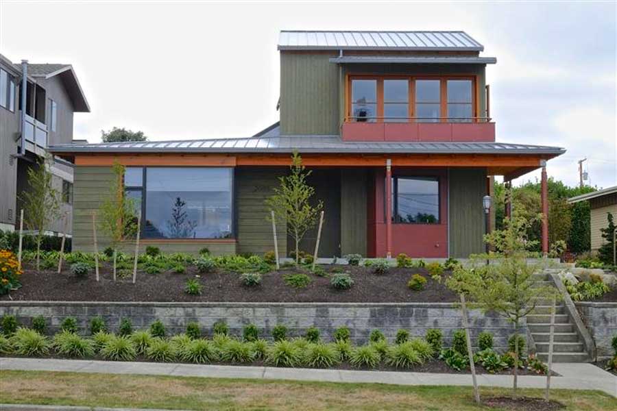 A 60 by 100 foot lot in the Old Town portion of Anacortes was bought with the intention of renovating and adding second stories to an existing house and garage. However, building codes made this impractical due to existing setback infringements. It was decided to tear down and start new. The existing retaining wall and stairs remain.