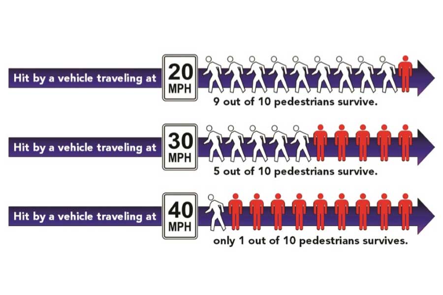 Pedestrian safety is a concern at 40 mph, with a better survival rate for pedestrians hit at 30 mph compared with 40 mph.
