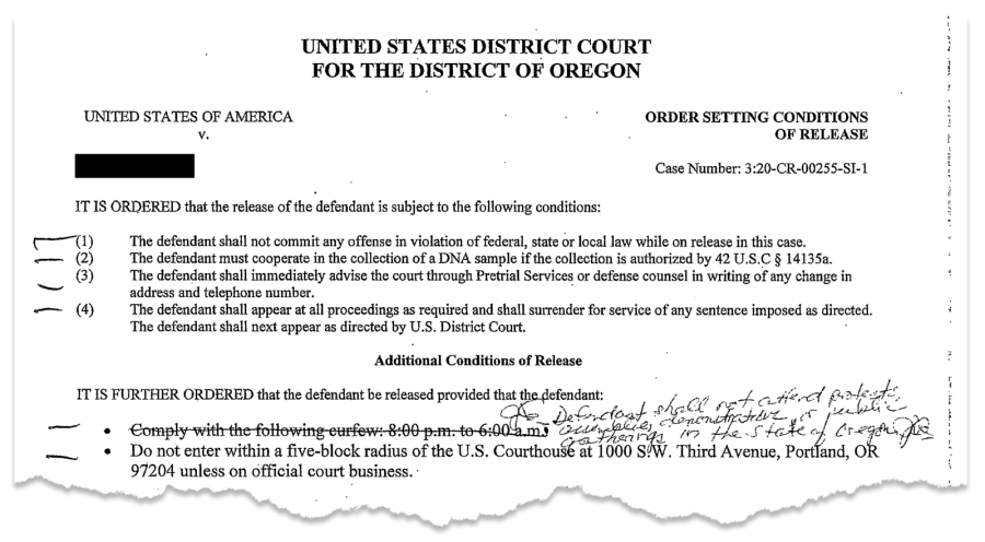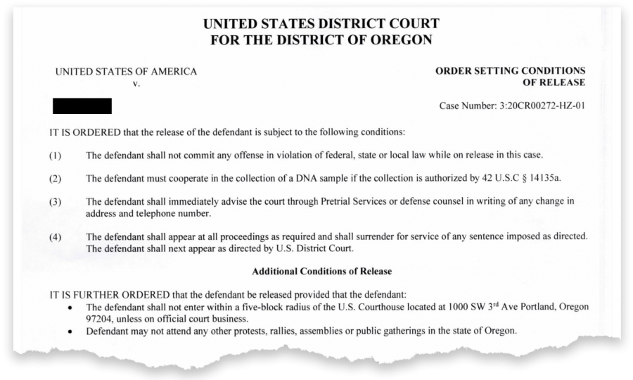 “Defendant may not attend any other protests, rallies, assemblies or public gathering in the state of Oregon,” states one “Order Setting Conditions of Release” for an accused protester, alongside other conditions such as appearing for court dates. The orders are signed by federal magistrate judges.