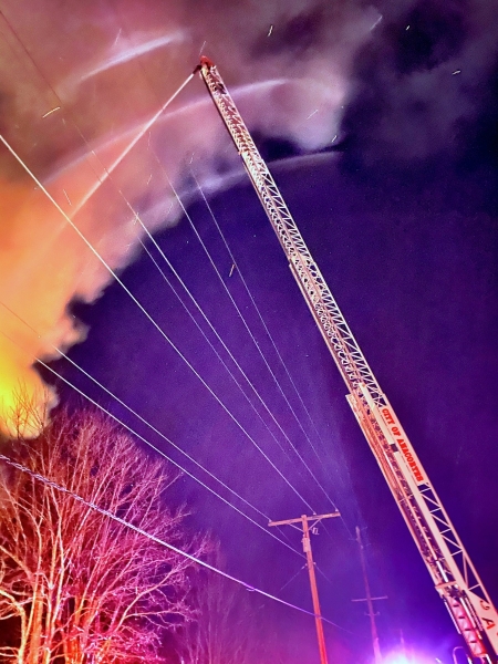 Crews initiated defensive tactics, fighting the fire from outside the structure which was unsafe to enter and a total loss on arrival. Dramatic flames illuminated the nighttime sky as firefighters deployed hose streams, both from the ground and the department’s ladder truck, to attack fire and protect surrounding structures. The truck’s ladder reaches 105 feet with a nozzle capable of flowing water at a rate of 1000 gallons per minute.
