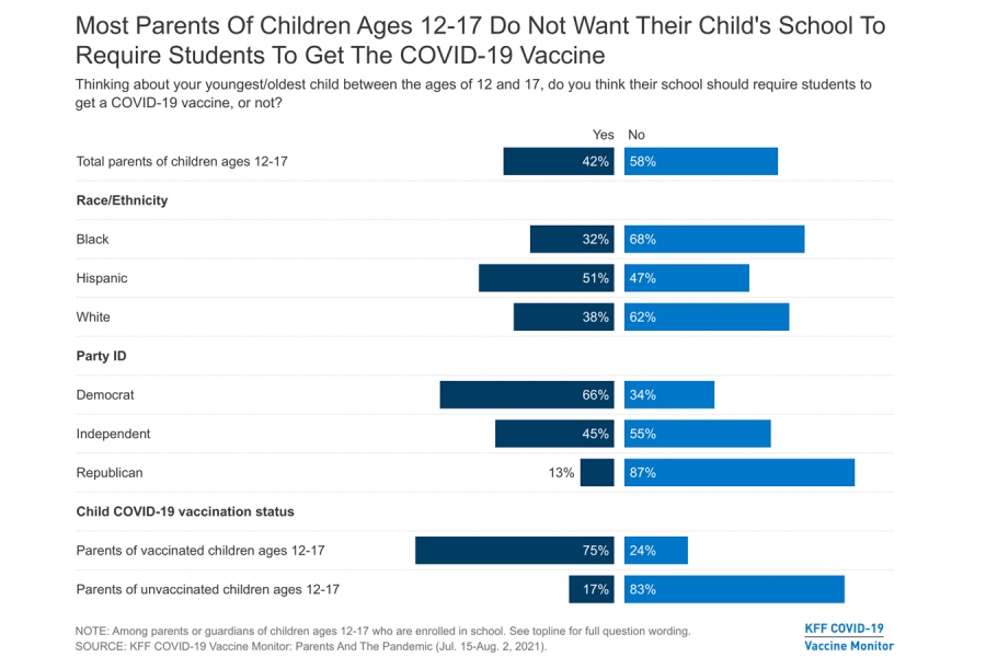 As of July, 41% of parents of children ages 12-17 said their kids had been vaccinated. An additional 6% said they wanted to get them vaccinated promptly, and 23% said they wanted to “wait and see.” Nine percent said they would get them vaccinated only if required and 20% said they would definitely not. “I think my child is healthy enough to battle the covid-19 virus without a vaccine,” a Hispanic mother from Georgia told pollsters.