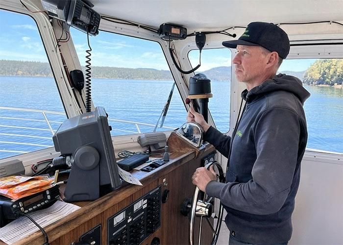 San Juan Safaris company owner Brian Goodremont helmed the 49-passenger vessel Sea Lion on the inaugural round trip of free foot ferry service to Anacortes. (Tom Banse)
