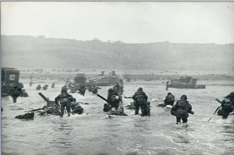 One of war photographer Robert Capa’s images shows a wave of troops arriving on the Normandy beaches on D-Day. Robert Capa via National Museum of American History