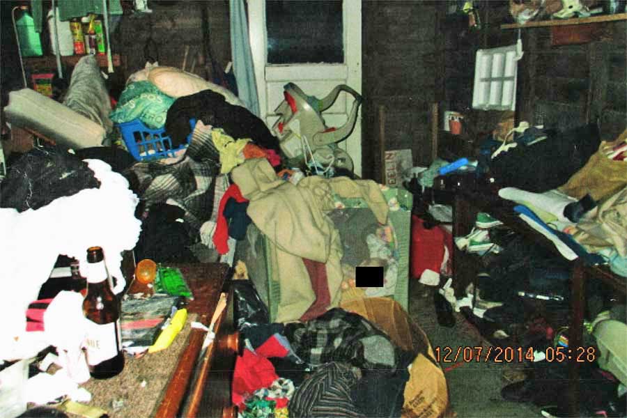 The crib was so packed with assorted things, a police officer couldn't tell right off if a child was in the crib. In the above police photo, obtained through a public records request, the infant's face is hidden by a black rectangle.